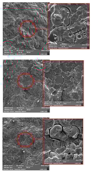 SEM micrographs of polypropylene/sodium lignosulfonate (PP/LGNa) blends with 10 (a), 20 (b), 30 (c), and 40 wt% (d) of LGNa with magnification of 200× and detail with magnification of 1000×.