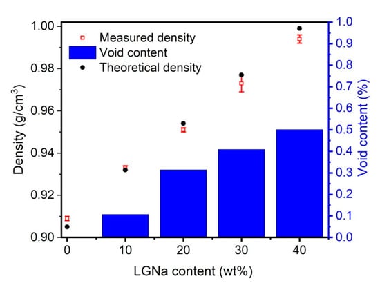 Theoretical and measured density of PP and blends of PP/LGNa showing the void content of all the blends studied.
