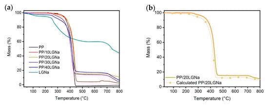 Thermogravimetric curves of PP, LGNa, and its blends (a) and comparison of the expected and experimental thermogravimetric curves of the PP/LGNa blend with 20 wt% of LGNa (b).