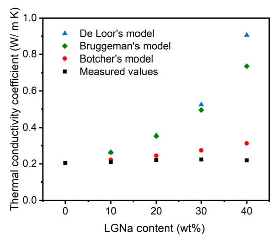 The experimental k values were compared with theoretical values obtained from theoretical models, as shown in Figure 4. Bottcher’s model predicts fairly well the k values until 20 wt% of LGNa particles. Bottcher’s model as also Bruggeman’s model assumes that the interactions among the particles can occur according to the increase in the volume fraction of one component, which can directly influence the material thermal conductivity [31,32].