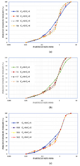 Tested grain size distribution curves for the group of sands with Cu equal to (a) 12, (b) 14, and (c) 16.
