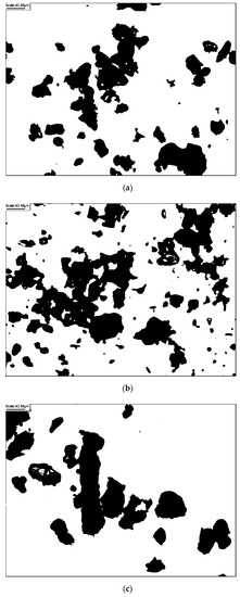 According to literature-empiric diagrams [30] and after observing the individual particles of representative samples through a microscope (magnification 20 times), the natural glacial quartz sands from Warsaw comprise sub-rounded to particles. Images of the individual particles of representative samples are given in Figure 2. The shape of the particles in terms of roundness and sphericity [28] were both estimated to range from 0.5 to 0.7.