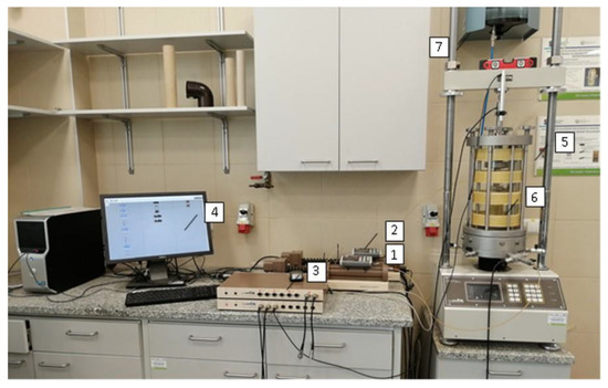Set-up of dynamic testing system at Water Centre in Warsaw University of Life Sciences: (1) back pressure controller, (2) cell pressure controller, (3) data logger, (4) PC and control software, (5) frame, (6) cell, (7) water tank.