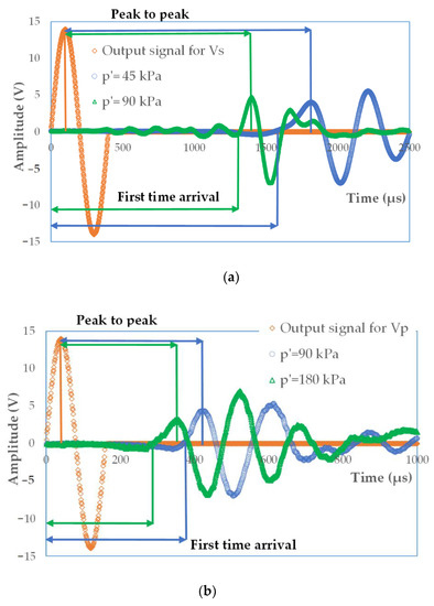 Typical plots of the input and output waves from bender and extender element tests for the specimens with code name S11 and S12 are given in Figure 4a,b. A wave was produced by a displacement in the source transducer due to applied excitation voltage equal to 10 V or 14 V. Wave transmission created a displacement in the receiver, which in turn resulted in a voltage that could be measured. The frequency of the input signal was variable and decreased from the value f = 25 kHz to f = 2.0 kHz for S-wave velocity and from f = 100 kHz to f = 10 kHz for P-wave velocity. For each test frequency, five separate source element triggers were applied to the specimen, with the received signal output then stacked in the time domain to remove random signal noise [55].