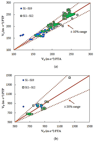 A comparison between the two selected different interpretation methods of shear and compression wave velocities is given in Figure 5. The data shown in this figure are clustered around the 45° lines, indicating an excellent agreement between the two analyzed methods. For more than half the number of the specimens (around 55% of the test results), higher shear wave velocity values were obtained from PTP method. The situation is similar in the case of compression wave velocity values. Here, for 61% of the data, VP from the PTP method is greater than VP from the FTA technique. Nevertheless, the differences between the results from both compared methods, for 99% of the results, are up to 10% for S-wave, and up to 20% for P-wave. The minimum difference between studied techniques in the case of VS is 0.1 m⋅s−1, whereas the maximum is −42.1 m⋅s−1. In the case of VP, the minimum difference is equal to 2.0 m⋅s−1, whereas the maximum is –223.0 m⋅s−1. From Figure 5 can be also seen that the FTA method of identification results in a relatively smaller variation as compared with PTP method.