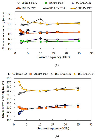 In Figure 6, shear wave velocities obtained for different source wave frequency for the test specimens S11 and S12 are presented. In this exemplary figure, a clear scatter of the results of VS calculated based on two selected signal analysis methods depending on the source frequency can be perceived. In the case of the lowest frequencies used (f < 3.3 kHz), the significant variation of the results was obtained (from around 4 m⋅s−1 to 30 m⋅s−1 —specimen S11 and from around 11 m⋅s−1 to again around 30 m⋅s−1 —specimen S12). It is most likely related to the aforementioned phenomenon of the near field effect. This was explained, e.g., in the work of Sánchez-Salinero et al. [59]. The authors suggested the lower limit of frequency of 3.3 kHz as the value which corresponds to an approximate propagation distance-to-wavelength ratio equal to two, avoiding data that may include near field effects. In the case of specimen S11, a relatively large discrepancy between the S-wave velocities was noted for f = 5 kHz (average 14.5 m⋅s−1), whereas for specimen S12, the scatter in estimated VS values for this frequency as well for frequency f = 10 kHz was the minimal (average 0.1 m⋅s−1). Therefore, for the investigated soils, it seems appropriate to choose a frequency closest to 10 kHz as the characteristic frequency. Generally, for all tested Warsaw glacial quartz sands, as the source frequency increases from the characteristic frequency, comparable VS values can be received, regardless of the travel time determination technique adopted (here, FTA and PTP).