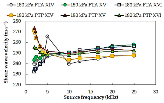 To verify any possible influence of multi-stage consolidation process on the VS results, shear wave velocities of specimen S12 from three consecutive consolidation stage, for mean effective stress p′ = 180 kPa, corresponding to the test series, with numbers respectively XIV, XV, and XVI, are summarized in Figure 7. Based on the analysis of the results, it was found that the differences between the respective VS values from individual test series of the same soil specimen were on average 4 m⋅s−1 (around 1%). The multi-stage consolidation procedure seems to be in fairly good agreement with the conventional one.