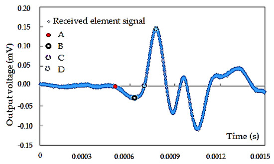 The first above-mentioned method is based on the visual inspection of the received signal and is still quite controversial and subjective due to the complex received signal, wave’s reflection, and the near-field effect. Many studies reported that the near-field effect decreases with the increase of frequency or the ratio of wave path length to wavelength (. Arulnathan et al. [14] reported that the near field effect disappears when this ratio is larger than 1.0. Pennington et al. [51] pointed out that when the values range from 2.0 to 10.0, a good signal can be obtained. Wang et al. [52] advocated a ratio greater than or equal to 2.0 to avoid the near field effect. Similarly, a value of 3.33 was recommended by Leong et al. [53] to improve the signal interpretation.