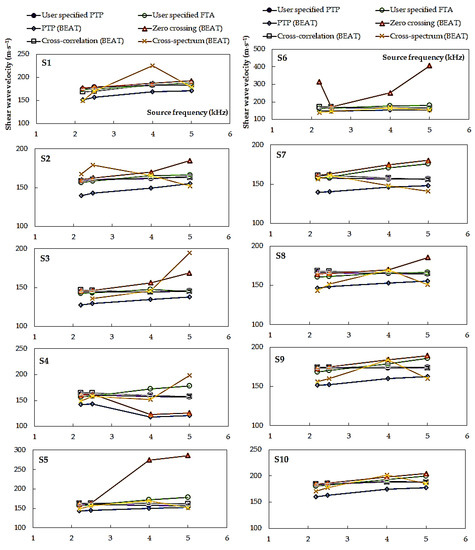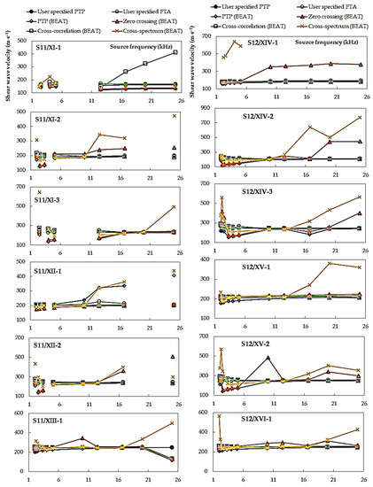 Inspection of Figure 10 indicates that the largest scatter of the results was obtained again for the cross-spectrum calculation, ranging from 193.3 m⋅s−1 (specimen S12/XV-2) to 593.2 m⋅s−1 (specimen S12/XIV-2). Analyzing the other methods, the zero-crossing technique is also characterized by a quite large discrepancy in the VS values, where ΔVS,min = 23.8 m⋅s−1 and ΔVS,max = 356.3 m⋅s−1. It may be suggested that estimates taken from these two above mentioned methods may be unreliable. In particular, the scatter observed from the cross-spectrum analyses has been previously reported following other studies [49]. Furthermore, the authors of the article themselves in their research devoted shear wave velocity of two types of anthropogenic material [42] received quite a large scatter in the submitted data from the frequency domain method. Therefore, it is quite dangerous to identify the arrival time only with this method. A significant decrease in the discrepancy of the results (±15.0 m⋅s−1), for specimens S11 and S12, was obtained for the peak-to-peak method specified by the user. The scatter in calculations from the cross-correlation function for these two specimens was also rather small (±40.0 m⋅s−1). These values suggest each method is relatively robust, an observation also made for the cross-correlation function after reviewing recent studies comparing analysis methods [15]. In the case of specimens S11 and S12, tested at three preset pressures (45, 90, and 180 kPa), the smallest dispersion of shear wave velocity (±131.0 m⋅s−1) was recorded for the source frequencies equal to f = 3.3, 4.0, and 5.0 kHz. The highest scatter of the results were obtained in the case of both the lowest (f = 2 kHz) and the highest (f = 25 kHz) frequencies set in BET.