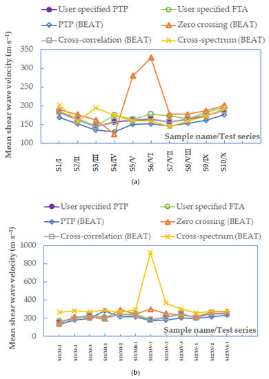 Summary of mean values of shear wave velocities from different interpretation methods when f < 3.3 kHz, data for specimens (a) S1–S10 and (b) S11–S12.