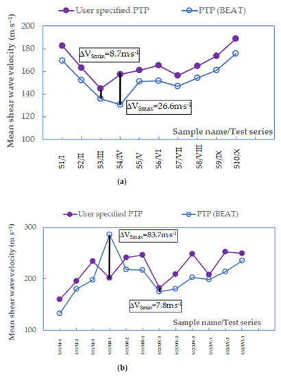 Mean values of shear wave velocities from peak-to-peak methods when f < 3.3 kHz, data for specimens (a) S1−S10 and (b) S11–S12.