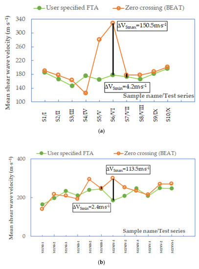 Mean values of shear wave velocities from the first time of arrival and zero-crossing methods when f < 3.3 kHz, data for specimens (a) S1–S10 and (b) S11–S12.