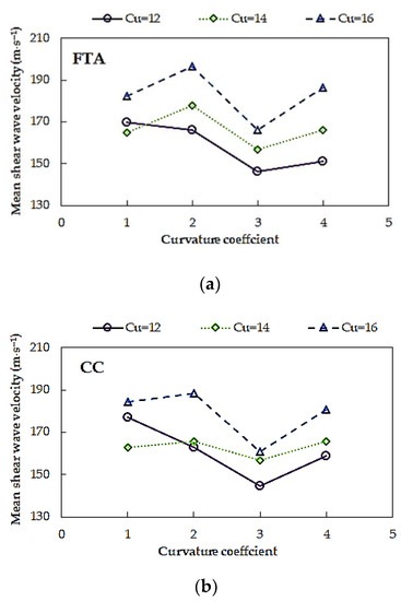 In Figure 14, the values of mean shear wave velocity obtained for all tested Warsaw glacial quartz sands at p′ = 45 kPa, from two selected time-domain methods for determining the wave travel time, versus the coefficient of curvature, are presented. This parameter took values from 1 to 4, whereas the test material was divided into three groups depending on the coefficient of uniformity. No clear dependence of the curvature coefficient (CC) on the VS values can be detected from the date in Figure 14. The highest values of VS have examined sands characterized by CC = 2, regardless of the CU value. The smallest shear wave velocity was obtained for sands with CC = 3. The greatest scatter of the VS results characterizes the specimens with CC = 4 (ΔVS,avg = 10%) and CC = 2 (ΔVS,avg = 8%), in the case of the FTA method. The smallest, however, have the specimens with CC = 1. When considering the results from the CC method, the significant variation in the VS estimates, i.e., 10%, was gained for sands with CC = 1, while the minimal one for sands with CC =3 (ΔVS,avg = 5%).