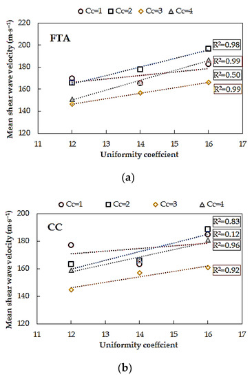 Effect of uniformity coefficient (CU) on mean shear wave velocity for sands of the same coefficient of curvature (CC) from: (a) first time of arrival method and (b) cross-correlation method.