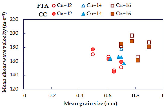 For further analysis, i.e., the influence of grain size characteristics on shear wave velocity of Warsaw glacial quartz sand, the mean values of VS obtained for p′ = 45 kPa were chosen. Moreover, such results were selected for which the quality of received signals was found to be satisfactory, also near-field effects and attenuation were found to be reduced. Then, the focus was put only on two interpreting travel times method: on the standard observational technique—the first time of arrival method (FTA)—and on the cross-correlation (CC) function obtained via BEAT analyses. These are the methods that provide the most consistent results for the studied soils.