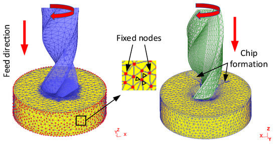 Due to the semi-closed processing conditions for drilling, problems exist between the tool and the workpiece such as friction, high drilling temperature, and difficulty in chip removal. The drilling temperature directly affects tool wear and tool life and has an essential impact on the machining accuracy and surface quality of the workpiece. It is also one of the current main focuses of metal drilling research. The study of tool wear is not only time-consuming but also costly, so that actual studies are often replaced by numerical analysis or empirical formulas. Attanasio [1] simulated the drilling process of Inconel 718 by the finite element method. A DEFORM-3D subroutine that considers the geometry of the drill bit was developed to calculate tool wear. To save simulation time, Matsumura [2] used a 2D method to study and analyze energy and chip flow during drilling.