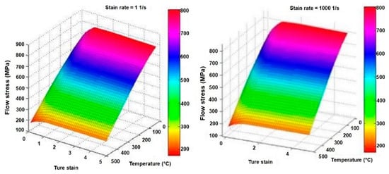 The material constitutive relationship in the software database can only reflect the authenticity of a drilling simulation to some extent. The flow stress data over the temperature range of 20–500 °C and a strain range of 0.05–5 are collected to obtain a more accurate simulation. Some sress–strain relationships are shown in Figure 3.