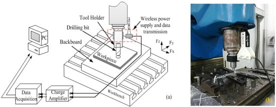 The test and data acquisition methods are shown in Figure 4a. The drilling process tests have the same drilling depths, workpiece thicknesses, and clamping conditions. The diameter of the drill is 10 mm, and the material is W6. The material in the simulation process is consistent with the experimental material. The spindle speed and feed speed are selected as variable parameters in this study. The maximum milling speed is 2200 rpm. Through the electromagnetic coupling technology, the axial force and torque data of the tool drilling process are collected in real time.