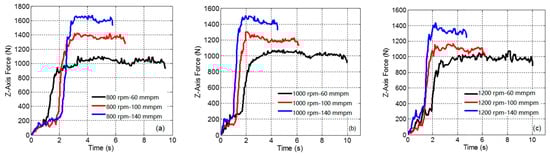 Axial force difference at different feed rates. (a) 800 rpm; (b) 1000 rpm; (c) 1200 rpm.