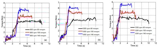 Torque comparison of different feed rates: (a) feed speed is 60 mm/min; (b) feed speed is 100 mm/min; and (c) feed speed is 140 mm/min.