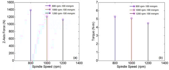 The influence of spindle speed: (a) the impact of spindle speed on the axial force; and (b) the influence of spindle speed on torque.