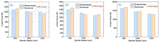 The experimental and numerical simulation data for the axial force are compared, and the two datasets are similar. When the rotational speed is constant, the axial force increases as the feed speed increases. When the feed speed is constant, the axial force decreases as the rotational speed increases. When the rotation speed is 800 rpm, and the feed speed is 100 mm/min, the maximum error is 3.25%. Figure 8a shows that the spindle speed has a relatively small influence on the axial force when the feed rate is low.