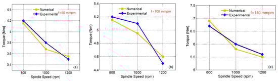 As shown in Figure 9, the overall trend of the numerical simulation results is consistent with the experimental tests. Under the same feed speeds, the spindle torque decreases with an increase in spindle speed, and the overall test results of torque are slightly higher than the numerical simulation data. A comparison of the results shows that the simulation and experimental data are consistent.
