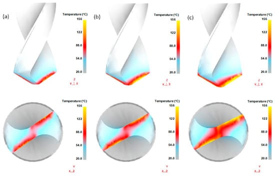 Through the axial force and torque data used to verify the correctness of the finite element model and modify the finite element model, it was determined that the temperature field in the drilling process has an important impact on the forming quality. Due to the limited space occupied by the drill bit, collecting the temperature of the drill bit area through embedded thermocouples does not work, so the temperature of the drill bit is simulated through the modified finite element model, as shown in Figure 10. As the feed rate increases, the temperature of the bit increases significantly. The rise in feed rate leads to an increase in cutting thickness. As shown in Figure 5 and Figure 6, both the axial force and the torque increase significantly. At the same time, the friction resistance of the interface increases, resulting in a higher temperature of the contact area.