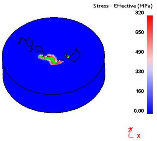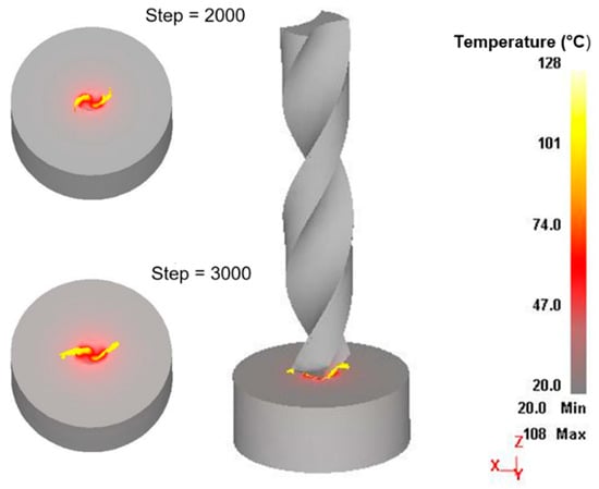 Combined with the analysis of the effective stress diagram of the workpiece in Figure 13, it can be seen that the effective stress is most significant at the beginning of chip formation in the drilling area, which produces higher deformation energy. At the beginning of chip formation, the friction between the drilling edge and the workpiece is more significant, and the heat generated by friction is also concentrated in the drilling area. Deformation energy and heat generated by friction cause the chip temperature to rise.