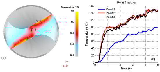 The temperature of the tool is tracked while rotating at 1000 rpm and a feed rate of 100 mm/min. The purpose of this paper is to study the distribution and variation of bit surface temperature in the process of drilling. Only representative particles need to be selected for research, and not too many points need to be selected. In the same way, we only need to take the representative test from many tests for analysis. As shown in Figure 12a, three particle points are marked on the drilling edge: p1 is set at the center of the chisel edge of the drill bit and p2 and p3 are placed on the two main drilling edges. The temperature change of the three particle points is tracked. As shown in the temperature curve for the three points in Figure 12b, the temperature rises rapidly in the initial plunging stage, and the temperature changes in the stable state of drilling are relatively small. The temperatures at p2 and p3 are the same, and the changing trend is also similar. The overall change trend for the p1 particle set on the chisel edge is similar to p2 and p3, but the temperature there is slightly lower than on the main drilling edge because the main drilling operation does not take place at P1, but at P2 and P3. P1 is mainly generated by friction heat, so the temperature rise caused by drilling heat is more obvious at P2 and P3 than at P1, which is also in line with the actual situation. The side proves that our virtual experiment is consistent with the actual situation, and more specifically reveals the distribution and variation law of bit surface temperature in the drilling process Wear law.