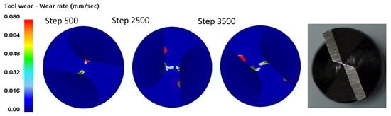 In general, the wear rate of the tooth surface increases as the feed speed increases, while the wear rate of the tooth surface decreases as the rotational speed increases. In addition, Figure 15 shows the wear distribution of the tool surface in the test and simulation. When the simulation step increases from 500 to 3500, wear occurs in the contact area between the tool and the workpiece, and it is also distributed along the drilling edge.