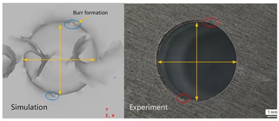 Due to the reduced processing rigidity of thin-walled parts, the lower strength of the workpiece is more prominent, so drilling burrs occur quickly. According to Wang [29], some materials adhere to the surface of the drill bit, making the resulting surface quality worse, and the rest of the material is discharged as debris. In addition, due to the high toughness and elongation of the aluminum alloy, this material characteristic makes the aluminum alloy workpieces easy to produce larger drilling burrs in the processing process. As shown in Figure 16, the numerical simulation results are similar to the test results and have sound hole forming conditions, while the numerical simulation results also show the generation of burrs.