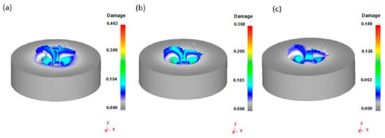 The damage value of materials at a spindle speed of 1000 rpm: (a) at a feeding rate of 60 mm/min; (b) at a feeding rate of 100 mm/min; and (c) at a feeding rate of 140 mm/min.