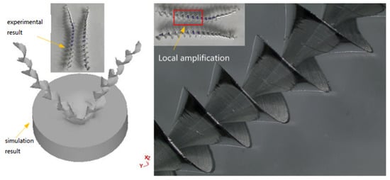 Figure 18 shows that the numerical simulation is similar to the chip formation shape in the test results. As shown in the chip micrographs in Figure 18, when the drilling quality is good, the chip surface is smoother, and burrs and flash are fewer. The chip forming process has an important influence on the quality of drilling, so it is essential to choose a reasonable damage model in the simulation process to simulate the real conditions of drilling. The test results verify that the material damage model can predict chip forming well.