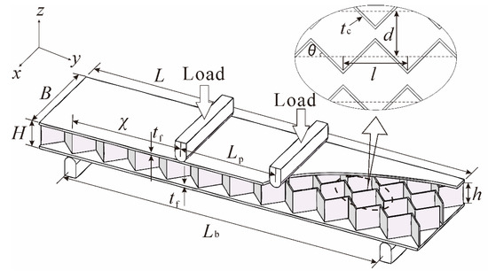 In practice, the corrugated channel core is in general not loaded in the transverse direction (y-direction in Figure 1) [32]. Therefore, contribution of the core to the flexural rigidity may be ignored. The equivalent flexural rigidity can thence be expressed as: