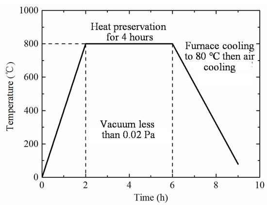 - Heat treatment: To eliminate residual stresses induced during 3D printing, the as-printed specimen (together with the supporting plate) is put into a vacuum furnace, with the furnace temperature controlled in accordance with that shown in Figure 3.