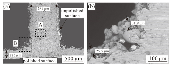 As-fabricated Ti-6Al-4V alloy 3CSP specimen: (a) SEM observation with low magnification view; and (b) detail of joint region in (a) marked by dashed line A.