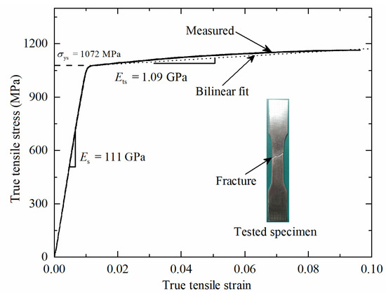 To characterize the mechanical properties of the parent material, dog-bone shaped tensile specimens of Ti-6Al-4V were manufactured with SLM 3D printing. To ensure identical mechanical properties, the dog-bone tensile specimens and the 3CSP test specimens for 4-point bending were fabricated simultaneously. Tensile tests were performed using a standard servo-hydraulic test machine (MTS-858 Mini bionix; MTS Corporation, Eden Prairie, MN, USA) at ambient temperature, with a nominal strain rate set as 1 × 10−3 s−1 in reference to ISO 6892-1:2009 [29]. The load and the strain were measured by the loading gauge with an accuracy of 1 N and an extensometer with an accuracy of 10−3 mm, respectively.