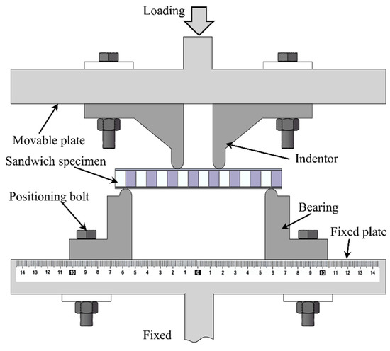 Both four-point bending and three-point bending tests are widely used experimental methods for assessing the bending response of a structure. Compared with three-point bending test, four-point bending test produces a pure bending region between the two indenters, thus reducing stress concentration in the region in close contact with the indenter. In the current study, the four-point bending experiment setup is illustrated in Figure 7. The sandwich specimen was placed between the indenters and bearings, both having a diameter of 10 mm. Four-point bending test was performed with an MTS-880 experimental loading system (MTS Corporation, Eden Prairie, MN, USA). With reference to testing codes ASTM C393-11 and D7249, the loading rate was fixed at 0.5 mm/min to mimic quasi-static loading. Analog signals for the load and displacement data were extracted by the measure sensors of the MTS system. To capture the deformation and collapse evolution of each specimen, a high-resolution photography system was utilized to record the entire experiment process.