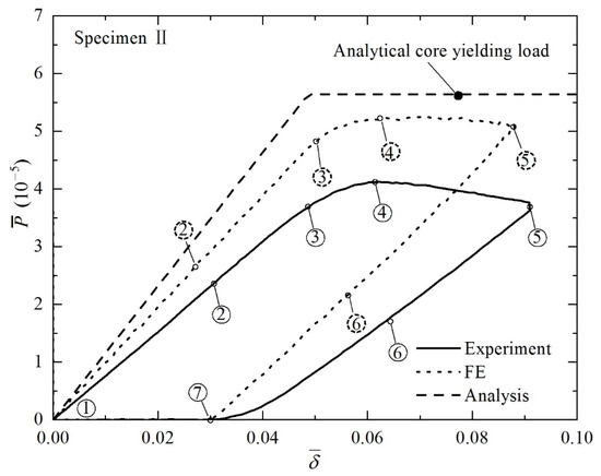 Non-dimensional load versus non-dimensional indenter displacement curve of Specimen II under four-point bending. Numbers circled by solid and dashed lines represent typical phases of structural responses observed in experiment and FE simulation, respectively. Corresponding deformed specimen configurations are displayed in Figure 10.