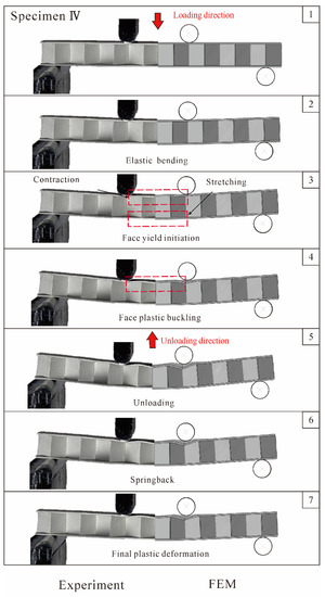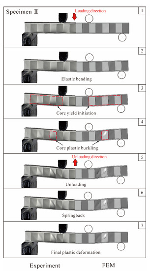 Figure 9 displays the experimentally measured, analytically predicted, and numerically simulated load versus deflection curves for 3CSP Specimen II (Table 1): note that the initial failure of this specimen is core yielding, as indicated by the analytical predictions. Corresponding to the circled numbers on the curves, photos of the deformed specimen are compared in Figure 10 with those numerically simulated. It should be pointed out that, during the present experiments, the method of synchronous triggering is used to ensure that data collection by the testing machine and image acquisition by the photography system have identical zero time. Thus, for any point on the load versus displacement curve, the exact photo image corresponding to this point can be extracted, thus enabling the comparisons shown in Figure 10 and Figure 12. The loading procedure is marked as Points 1–5, while the unloading as Points 6 and 7. As Figure 9 illustrates, during loading, the bending response of Specimen II is composed of three major phases: (i) the elastically loading phase (1–3); (ii) the plastically stable phase (3–4); and (iii) the plastic buckling phase (4–5). The results in Figure 9 and Figure 10 show that the key features obtained with FE simulations agree with corresponding experimental observations. In the elastically loading phase, the initial failure load increases linearly with indenter displacement . The specimen exhibits global bending, with no obvious out of plane deformation in the face sheets and core webs, as shown in Sequence 2 of Figure 10. With further loading, a plastic stable phase emerges, represented by 3 and 4 in Figure 9, wherein a gradual reduction in stiffness occurs, and the load reaches a peak at Point 4. From the corresponding Image 3 shown in Figure 10, the premature collapse initiation of core yielding can be seen in the core shear region between the indenter and the bearing. As the loading continues, shear deformation in the core becomes more visible in Image 4 of Figure 10. Then, the plastic buckling response begins and the load decreases with increasing indenter displacement. Subsequently, an unloading procedure is performed. The corresponding response is shown on the experimental and simulation curves as 5–7. During unloading, as elastic strain energy is released, springback of the specimen occurs, the radius of curvature becomes larger, and the deformation decreases. When the load is dropped to 0 N, permanent plastic deformation characterized with core yielding dominates the specimen.