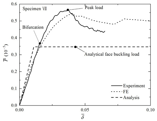 In addition to the collapse modes discussed above for Specimens II and IV, face buckling is captured in Specimen VII, both experimentally and numerically. Its final deformation patterns and load versus deformation curves obtained via experiment and FE simulation are displayed in Figure 13 and Figure 14. Good agreement is obtained between numerical and experimental results for bending stiffness and initial failure load. The elastic buckling of a plate is well known to exhibit a stable post buckling response [33]. Therefore, the peak loads obtained from the present experiment and simulation are much larger than that predicted analytically, as shown in Figure 14.