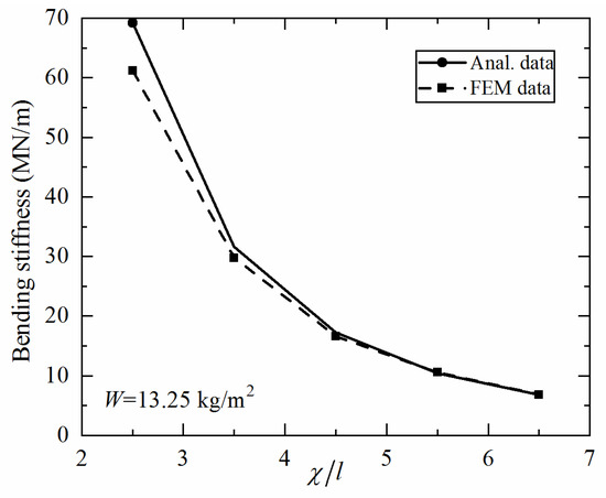 When developing the present analytical model, the bending deformation of a 3CSP specimen is taken as the superposition of deformation caused by the bending moment and that induced by the shear force. The former is dictated by the bending stiffness of the face sheets, while the latter is dominated by the shear stiffness of the core. The equivalent shear stiffness of the core, as shown in Equation (5), is derived via homogenization, which requires that a sufficiently large number of cells are present within the characteristic length of the 3CSP structure [34]. In the current study, due to 3D printing accuracy and constraints on printed cell size, the ratio of characteristic length to unit cell length is for each specimen. This causes the discrepancy between analytical model and FE simulation. Figure 16 plots the analytically predicted bending stiffness as a function of for specimens having identical total mass (). For comparison, results calculated with the FE model are also presented. It is shown that the two curves converge only when the value of is sufficiently large, e.g., at . Therefore, to ensure the prediction accuracy of analytical modeling for 3CSP structures, special focus needs to be placed upon the magnitude of in future studies.
