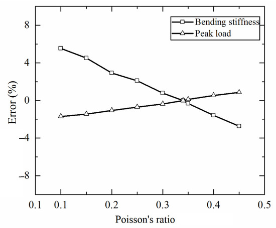 As mentioned above, in the absence of Poisson ratio for 3D printed Ti-6Al-4V, a Poisson ratio of 0.34 measured using traditional rolled titanium alloy sheets is used in the present study. In this section, how the bending response of a 3CSP structure is dependent upon the value of Poisson ratio is quantified using the FE model. As the value of Poisson ratio is varied in the range of 0.10–0.45, Figure 17 presents the errors of numerically calculated bending stiffness and peak load relative to the reference case of Poisson ratio equaling to 0.34. It is shown that, for the bending stiffness, the largest error of 5.54% occurs when the Poisson ratio is 0.1. Similarly, for the peak load, the largest error of 1.7% also occurs when the Poisson ratio is set to 0.1. Overall, the influence of Poisson ratio on the numerically simulated mechanical performance of 3CSP structures is small.