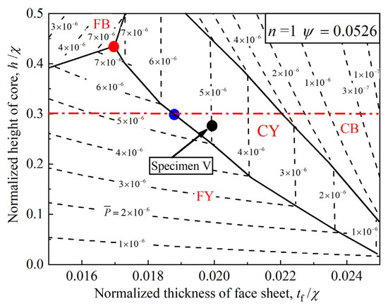 To facilitate visualization of optimization results based on failure maps, Figure 18 plots a prototypical collapse map for the scenario of and , where “FB” “FY”, “CB”, and “CY” represent abbreviations of the four collapse modes. “F” and “C” represent “Face sheet” and “Core”, while “Y” and “B” represent “Yielding” and “Buckling”, respectively. Non-dimensional initial failure load contour plots for the 3CSP structure with different geometries are delineated via the dashed lines. With these contour plots, the optimal geometries can be obtained by searching for those associated with higher values. Optimal geometries thus obtained are marked with and without considering geometry limitation, represented by red and blue solid circles, respectively. For a 3CSP specimen with , excellent bending resistance can be achieved by a geometry lying at the intersection point (red solid circle) of face buckling, face yielding, and core yielding, if geometrical limitation is ignored. The optimal geometry lies on the confluence (blue solid circle) of face yielding, core yielding, and geometric limitation (if geometric limit is considered). Further, given the geometric parameters of Specimen V in Table 1, its bending resistance can be effectively enhanced by decreasing the normalized thickness of face sheet and increasing the normalized height of core (black solid circle in Figure 18).