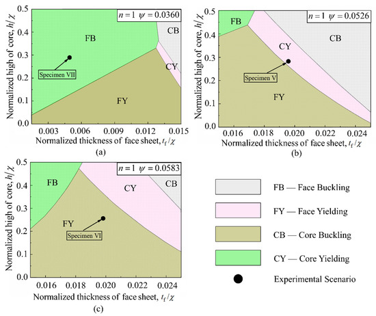 The domination of collapse mode(s) also varies with varying structural mass. As the value of is increased, the region representing core collapse grows, as shown in Figure 19a–c. For the scenario of and (Figure 19b), the component of the collapse mechanism map assembles with the four competing collapse modes: i.e., face sheet buckling, face sheet yielding, core buckling, and core yielding, consistent with the scenario of and (Figure 19c). However, Figure 19b,c shows that the core buckling and core yielding collapse regions gradually expand relative to those of Figure 19a. Additionally, the solid circles marked in each collapse mechanism map of Figure 19 reveal that the 3CSP specimens tested in this study do not have optimal geometries.