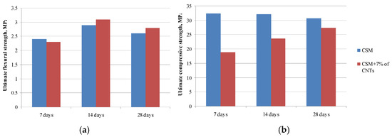 The physical and mechanical properties of the compositions were determined to assess the effect of modifying additives. The flexural strength at the age of 28 days of the modified sample exceeds the corresponding parameter of the control sample by 7% and the compressive strength decreases slightly within 10% (Figure 2). At the age of 28 days compressive and flexural strength changes slightly due to the fact that the role of multiwalled carbon nanotubes in this case only as a filler.
