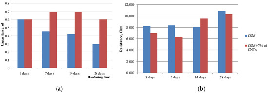 Changes of electrical characteristics of control sample (CSM) and sample modified with 7% of carbon nanotubes (CNTs): electrical capacity (a), resistance (b).