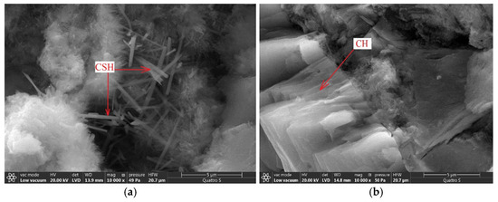 Determination of electrical characteristics and comparison of control and modified samples showed that the use of the optimal amount of carbon nanotubes in the amount of 7% by cement mass has a positive effect on electrical capacity and resistance. Thus, the electrical capacity of the modified sample exceeds the electrical capacity of the control one by 2 times, while the resistance of the modified sample at the age of 28 days decreases up to 12% (Figure 3). The addition of multiwall carbon nanotubes leads to the formation of a volumetric spatial grid of nanostructures and hydration products that one can see below in the micrographs. This grid provides for the free movement of charged particles, probably due to the occurrence of a tunnel effect similar to the percolation effect [35] that occurs in polymer matrices, which is confirmed by the results of determining the electrical capacity: the control sample “accumulates” the charge, while the addition of additives can significantly reduce the electrical capacity (Figure 3a). However, over time the positive effect of addition of multiwall carbon nanotubes decreases due to the formation of a volumetric structural framework including calcium hydroxides and calcium hydrosilicates (Figure 3b and Figure 4).