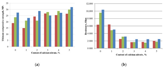 It is known [36] that calcium nitrate is a hardening accelerator of cement due to creation of an excess of calcium cations in liquid phase of cement paste. The effect of the additive is expressed in an increase of compressive strength and in an additional decrease of electrical resistance as shown in Figure 8.